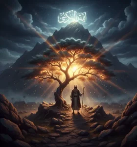 Years later, while traveling with his family, Musa (A.S.) saw a glowing light on Mount Sinai. Hoping for guidance, he climbed the mountain. There he witnessed a miracle: a tree burning with a light that did not consume it.